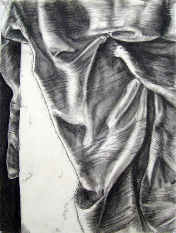I've provided an example of a drapery study below, created by a student last semester. The top image is the full study, followed by a series of details. This will be the same piece of fabric you will be using, so please take not of how the student has used value to carefully define the ridges on this sheet.
